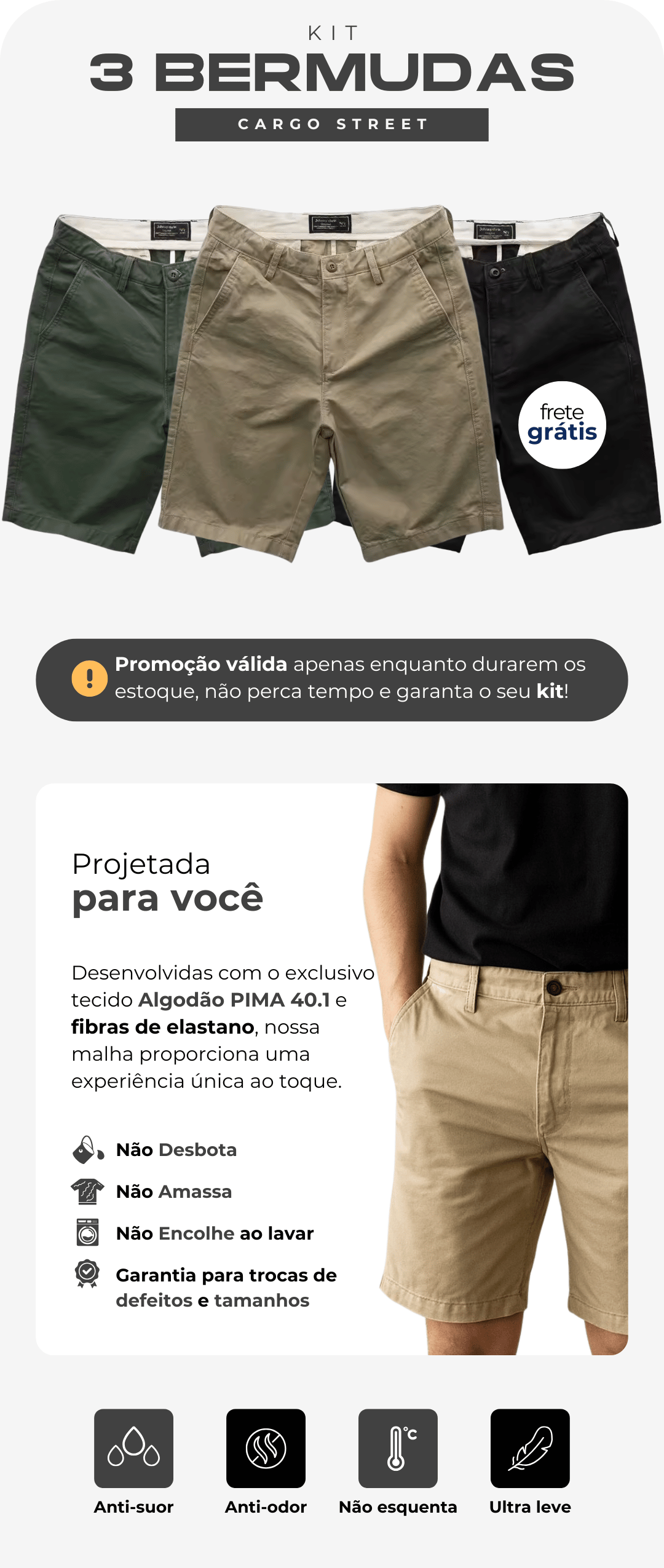 Transforme seu guarda-roupa com o Kit 3 Bermudas. Perfeito para quem valoriza estilo, conforto e versatilidade, essas bermudas são confeccionadas em sarja 100% algodão, proporcionando frescor e elegância nos dias mais quentes.