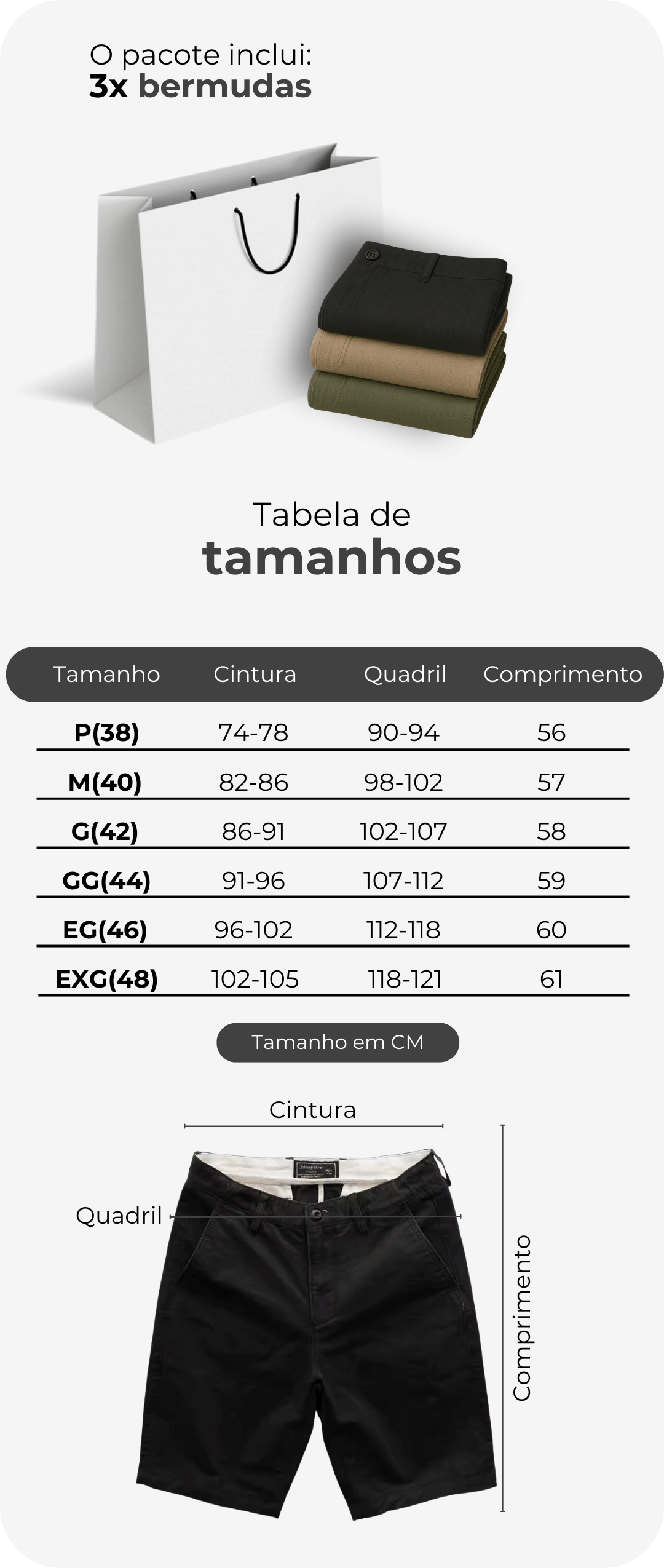 Transforme seu guarda-roupa com o Kit 3 Bermudas. Perfeito para quem valoriza estilo, conforto e versatilidade, essas bermudas são confeccionadas em sarja 100% algodão, proporcionando frescor e elegância nos dias mais quentes.