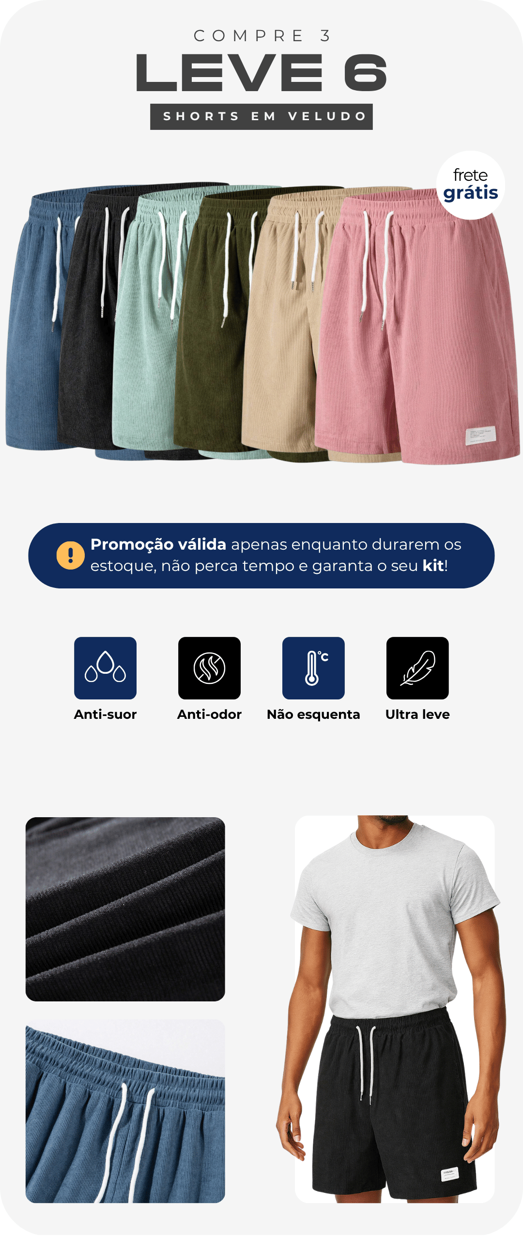 Transforme seu guarda-roupa com o Kit 4 Shorts em Veludo. Perfeito para quem valoriza estilo, conforto e versatilidade, esses shorts são confeccionadas em 100% algodão, proporcionando frescor e elegância nos dias mais quentes.